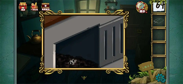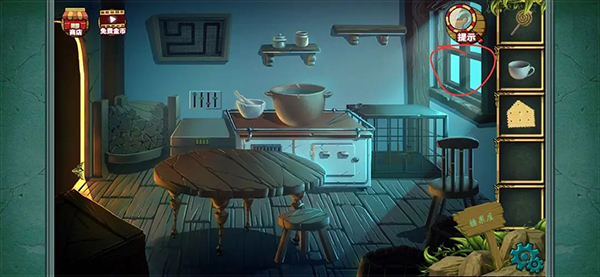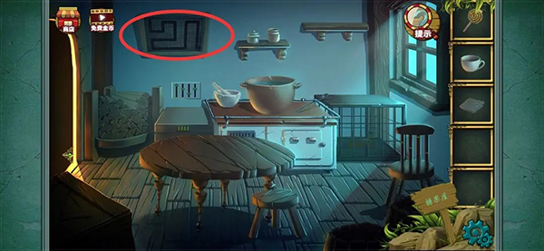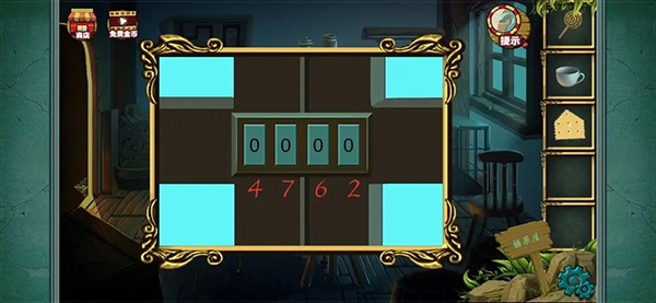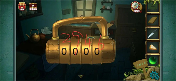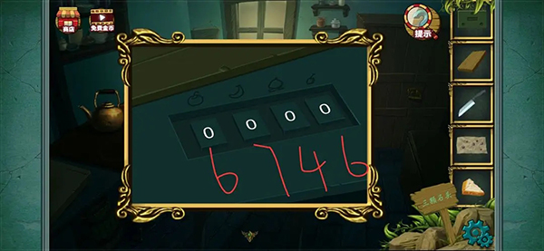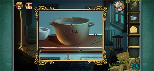 完成后得到一块五边形饼干 以后点击图中的锅 用抹布擦拭干净 得到数字密码提示 4762