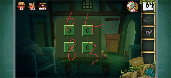 然后回到大厅 点击左边门旁边的密码锁 根据两张字条得到密码为6483
