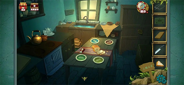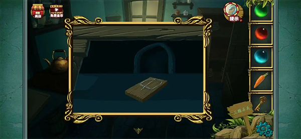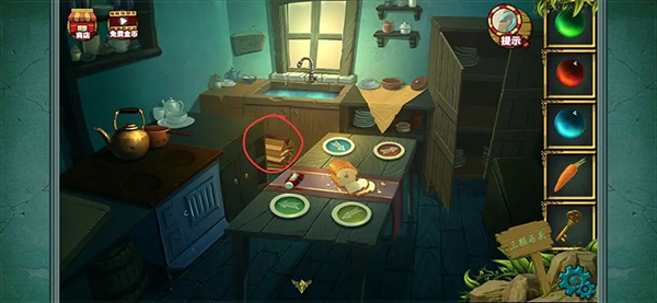 然后使用小刀将胡萝卜切片 可以得到三个圆形的胡萝卜块 然后点开我们之前在卧室得到的盒子 将胡萝卜块放上去 根据左上角密码提示完成小游戏(点击上 左 右三个胡萝卜块将密码调到312就行 很简单的 大家自己试一下 我忘记记步骤了 )
