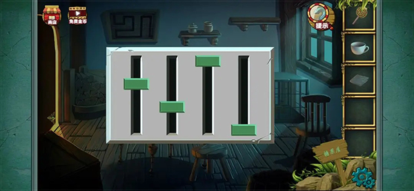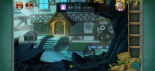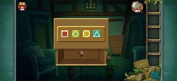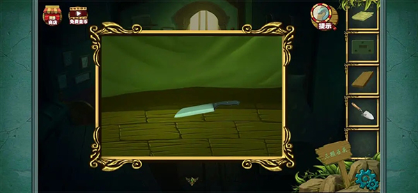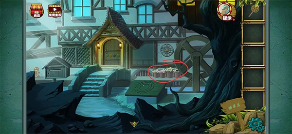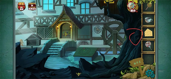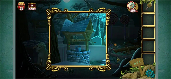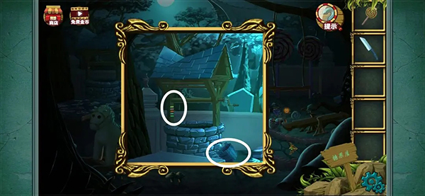 拼成这样就差不多了 完成后得到一把刀然后记住下方的糖果提示 之后会用到(小伙伴玩这种游戏的时候看到可疑的提示都可以注意下 后面都会用的到的 ) 然后点击台子上方的水井 可以看到一个颜色提示记下来 然后拾取水桶
