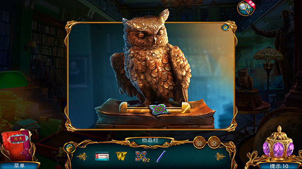 来到金色地球仪,打开获得紫外线灯和拼图嵌块1,点击猫头鹰,得到拼图嵌块2