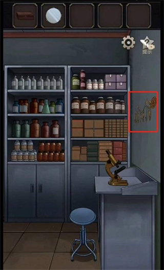 20、在研究室当中在墙上可以获得一把钥匙。点击下面的显微镜,将之前洗干净的镜片放上去。