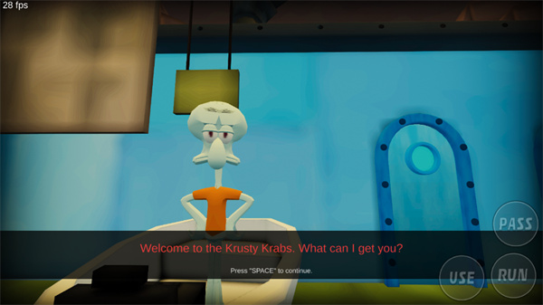 3、进入蟹堡王餐厅,与章鱼哥对话;