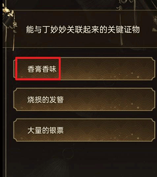20、之后在房间当中还可以得到丁渺渺房间香膏的气息这个线索,之后开始进行推理丁渺渺的嫌疑,如图进行放置。