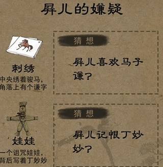 7、之后在询问和丁妙妙的关系,之后在整个房间当中可以找到屏儿的刺绣手帕上绣着谦字还有屏儿诅咒丁妙妙的娃娃。