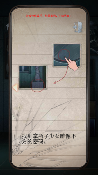 6、男孩雕塑机关的密码如图,先拉开第三场景中窗帘,点击两次拼图,再回到第三场景,点击窗户