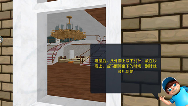 3、每个关卡前都会有说明,比如第一关进屋后,从外套上取下别针,放在沙发上,当玛丽简坐下的时候,别针就会扎到她;