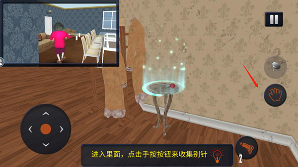 7、进入里面后,点击手按钮来收集别针;