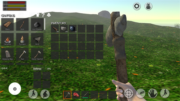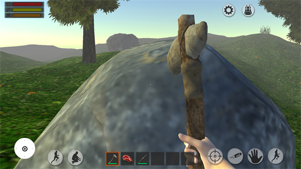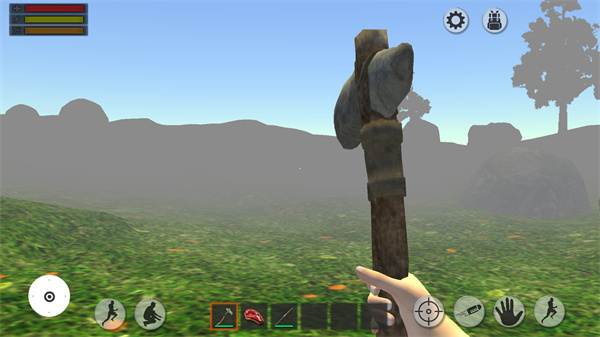 下载森林生存的最新版本后,第一次进入游戏时,背包里仅包含石斧、肉和长矛等基础物品。