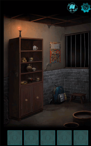 【启】墙上画像(柴米油盐酱醋茶)→柜子背面的图案指示方向→右右左左左右右→擀面杖、锤子→墙边的链条→书包里装衣服→衣服浸湿→绑在铁栏上→用擀面杖拧干→离开