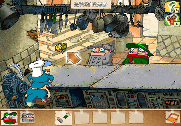 2、过关要点:点击服务员旁边的按钮会让服务员上餐,而老鼠就在食物中,首先要收集场景中的奶酪、刀子、相册、盖子把他们用合理的方式布置成一个陷阱,这样老鼠路过的时候会落入陷阱,这样就抓住老鼠了。