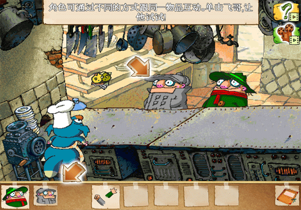 2、关卡要点:首先用飞哥使用木板和桶搭起,然后使用电话和门卫通话,吸引门卫的注意力,这个时候让飞弟先进入车站。然后在运货的人进入门的瞬间旋转门把运货的人打飞,飞哥再躲进箱子里,运货人回来吧装着飞哥的箱子搬进车站,这样兄弟二人就都进入了车站。