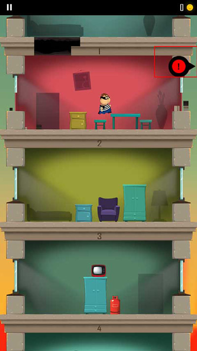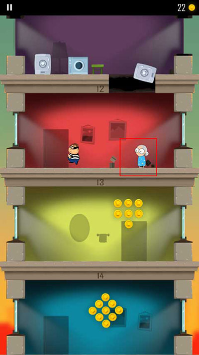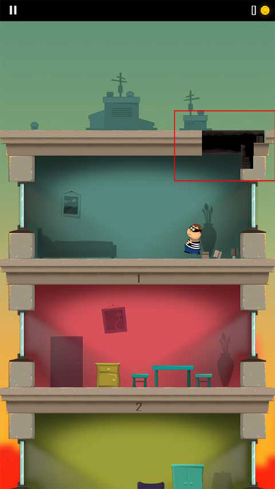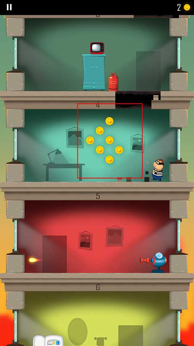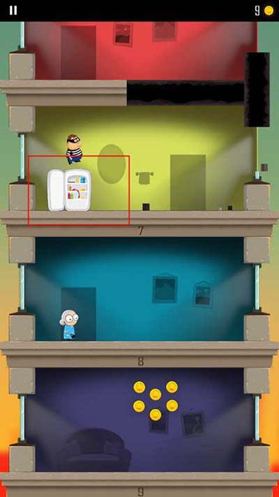 1、游戏开始会有一个小偷开始跑到另一层楼,玩家需要做的就是通过角色屁股着地的方式破开楼层,这样就能不断到达底下那一层了;