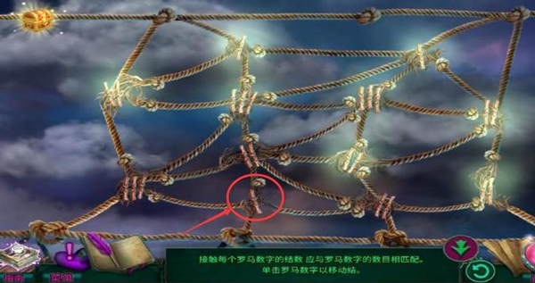 1、根据小游戏的提示可以知道,下图标记出来的是罗马数字二,所以它周围是两个绳结,对应正确该地方的罗马数字就会发出光亮