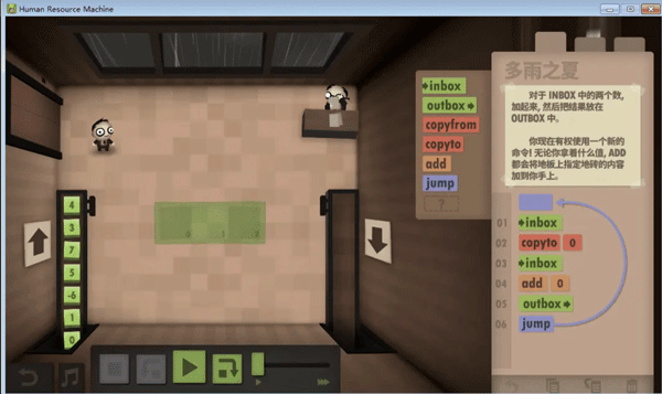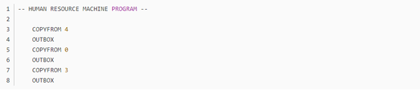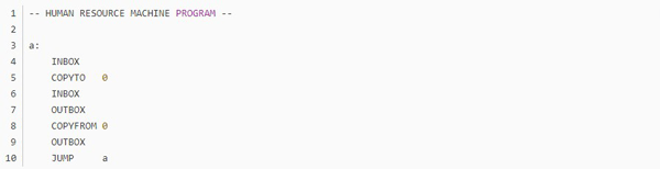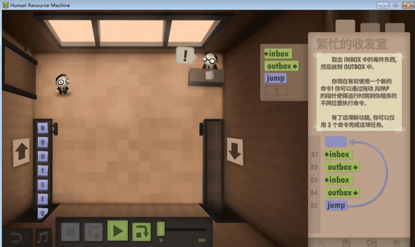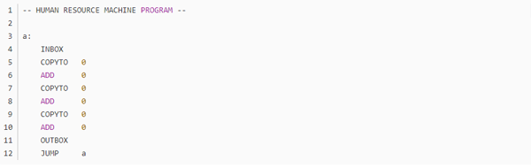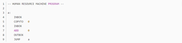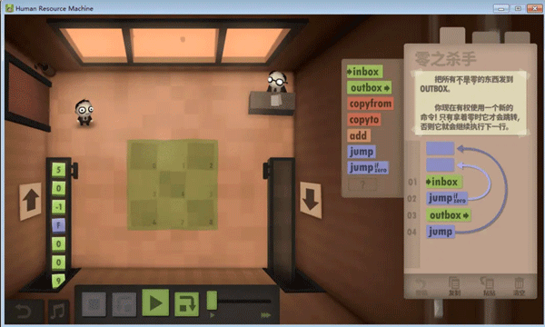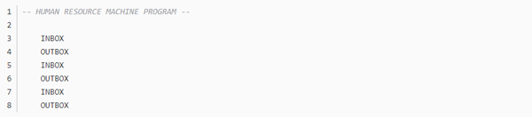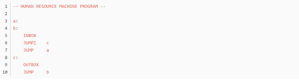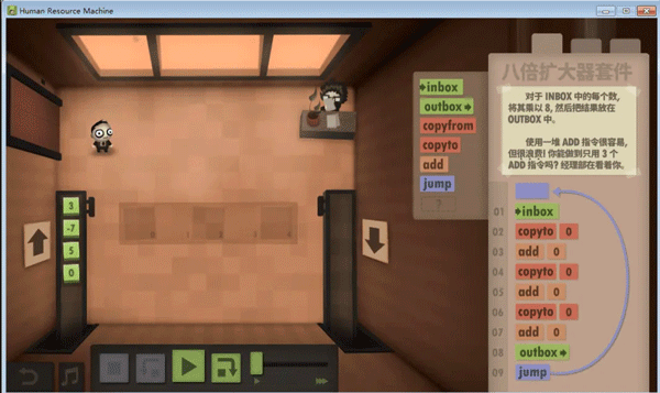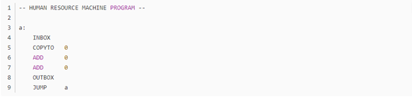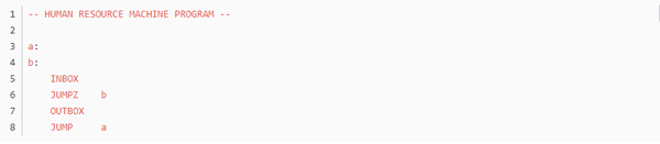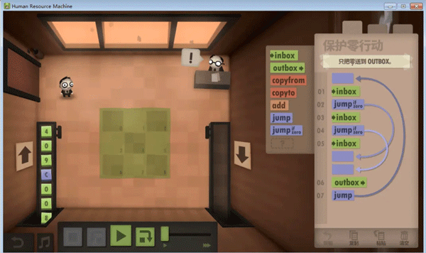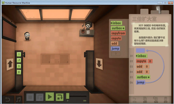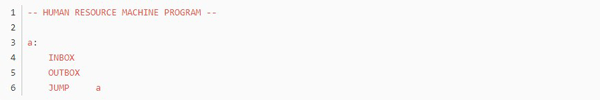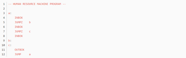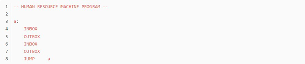 不知道大家留意没,这个游戏的编程是没有终止命令的,而绝大多数任务都是靠循环的,那到底怎么样才算程序的结束呢?通过头机关,不难发现,代码走完了,程序就结束了,这个符合直觉对吧。但那些无法跳到底的程序呢,我觉得是靠触发inbox来实现的,当使用inbox时,如果输入队列为空,则程序跳出。这里就产生了一个问题,如果inbox离循环入口太远,那输出最终结果后,又得多运行几个动作才能到达inbox(null),增加总步数,如无必要,此处可优化。
