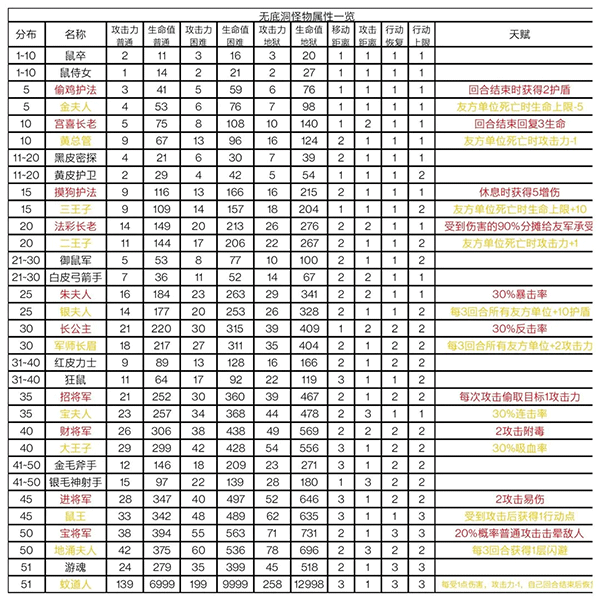:不同难度仅怪物攻击力和生命值不同,均为51层。以困难难度的怪物攻击力和生命值为单位1,则普通难度为0.7,地狱难度为1.3(小数均向上取整)。