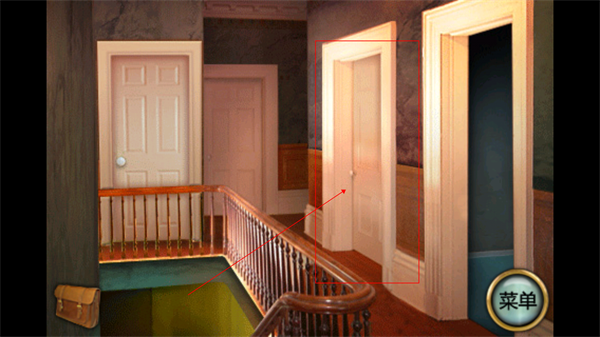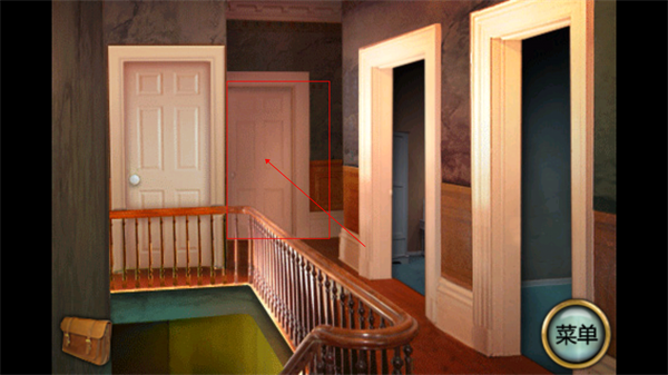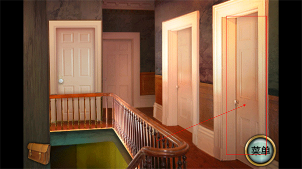 3、点击楼梯最上面,进入二楼,可以看到四个房间门,点击右边第一个房间进入,注意小猪存钱罐、墙壁上的蝴蝶标本、一幅画。