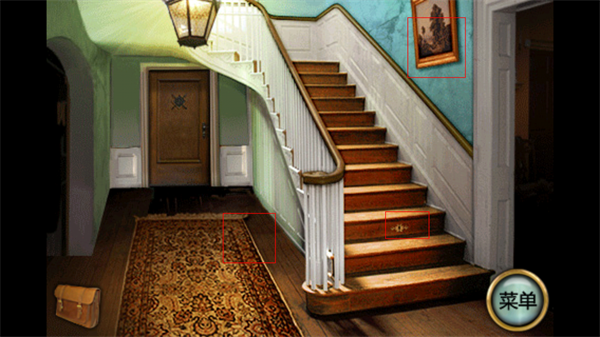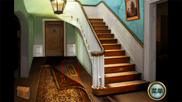 2、打开大门,进入大厅可以看到一个楼梯的房间,大家注意底下的地毯、楼梯墙壁的壁画、楼梯上的钥匙孔,以及正对面的一扇门。