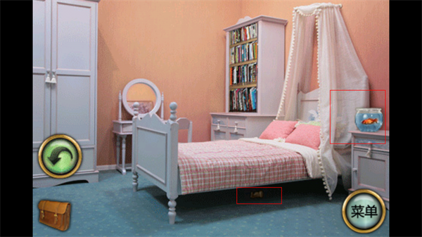 4、进入右边第二个房间,找到桌子上的鱼缸,收集起来(后面可以用来灭火),找到床底下的棋子。