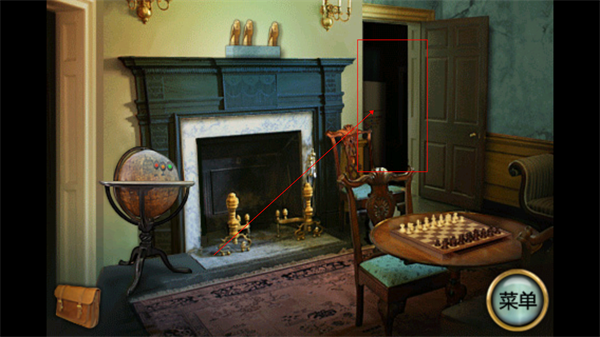 7、下楼,回到一楼,在楼梯的右边也有一个房间,点击进去可以看到是一个有壁炉的客厅,注意棋盘、地球仪、壁炉、壁炉上面的鸟。