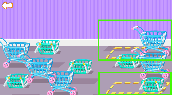 2、游戏玩法是颜色、类型归类,把相同颜色的购物车移动到相同的方框内即可完成;
