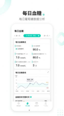 1、通过佩戴的CGM传感器了解你的实时血糖情况,跟踪血糖波动数据等。