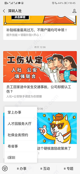 点击公众号菜单栏中的“互动”,即可在线查看深圳的人社局服务地图、办事指南以及最新政策消息等