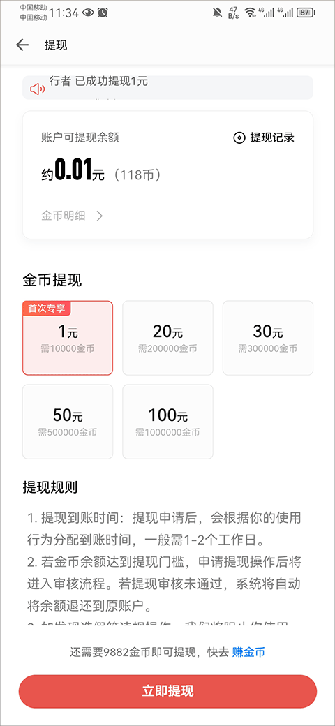 若金币余额达到提现门槛,申请提现操作后将进入审核流程。若提现审核未通过,系统将自动将余额退还到原账户。