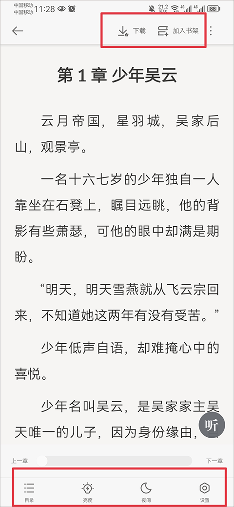 选择小说后点开即开阅读,点击屏幕后还可以呼出菜单,用户可以将它下载、加入书架,也可以查看目录、调整亮度、更多设置等