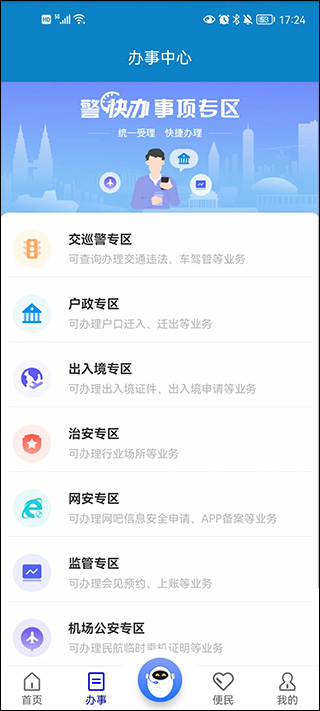 1、软件向广大人民群众提供哪些办事服务?提供户籍、身份证、居住证、出入境、交警、治安、监管、网安等相关业务