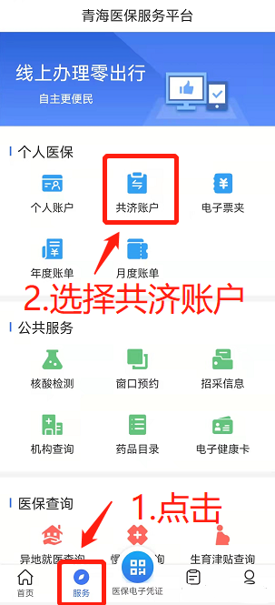 家庭共济账户的建立采用线上(青海医保APP、自助终端)、线下(医保经办大厅)方式办理。建议参保人员通过实名注册青海医保APP,按操作提示完成共济账户的创建。首先确定创建人和被共济人都已下载青海医保APP,并激活医保电子凭证。然后由创建人登录青海医保APP,点击“服务”选择“个人医保”——点击“家庭共济”
