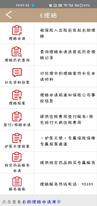 2、理赔服务:理赔服务可以发起自助理赔申请,按照详细流程操作即可。