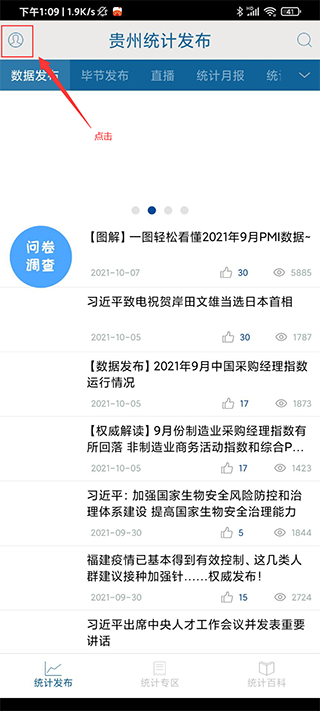 首先用户需要注册账号1、打开“贵州统计发布”,点击左上角的菜单按键打开侧滑菜单;