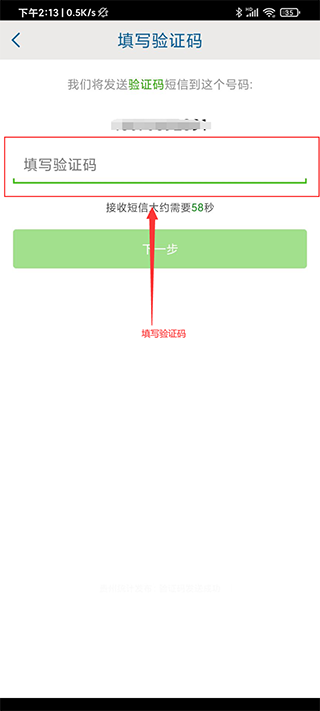 5、将手机上收到的验证码填写在“填写验证码”的输入框内;