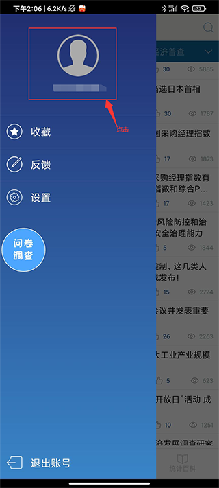 1、进入到app首页,需要先登录;2、点击屏幕左边的“问卷调查”;