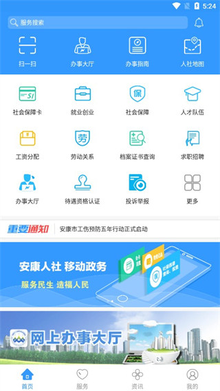 2、进入后便可以看到软件分为了四大板块和诸多实用功能,例如社会保障卡、就业创业服务、工资分配等等。