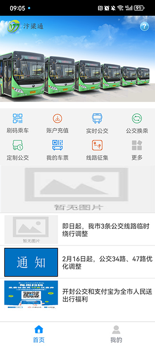 用户在登录成功之后会跳转到首页,在首页可以查看公交资讯,以及使用刷码乘车、账户充值、实时公交等功能。