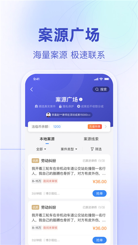 海量案源实时更新,当天入驻立即接案,精准筛选匹配需求,打你擅长的官司。支持案件类型、地区等多维度筛选,确保律师找到最合适的案件。案源详情页提供案件背景、当事人需求等详细信息,帮助律师快速了解案件情况。案源锁定功能,确保律师优先获取案件资源。