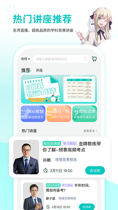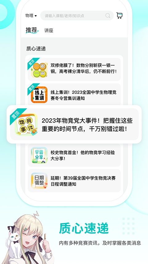 多学科竞赛资源:现已上线物理、生物、化学、数学四个学科,每周都有配套的免费竞赛讲座,帮助学生深入了解各个学科的竞赛知识和技巧。