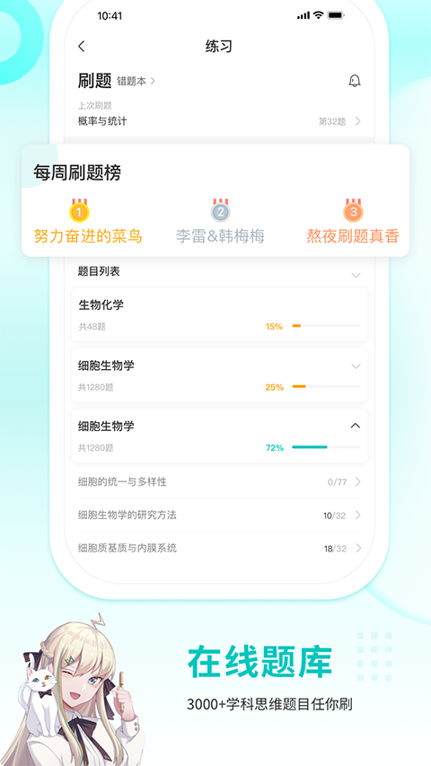 免费题库:海量经典题目,学生可无限刷题。同时,学生可以随时查看刷题量和正确率,以便更好地评估自己的学习状况。