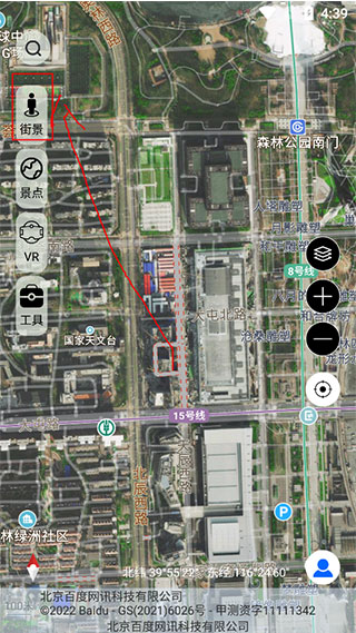 如果这些功能还不能满足你,可以点击工具箱,探索更多实用功能。除了身临其境地观看不同景区的美景,你还可以进行电磁探测、测量面积、线路测量等操作。点击放大镜,在搜索框输入家乡的名字,转化为街景模式,瞬间带你梦回家乡。不过,小编还是提醒大家要常回家看看。需要注意的是,部分功能需要VIP才能解锁,但这也是为了提供更好的服务。