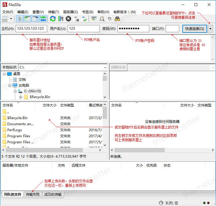 用户名和密码:这里指的是FTP的用户名和密码,而不是服务器的。所以如果你还没有FTP账号密码就需要联系服务器商家帮助解决,如果是自己购买的云服务器,你可能需要自行解决或者付费找我们寻求帮助。