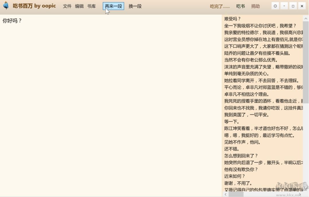 注意:吃书软件仅能吃掉txt文本格式的书。输入文字以,。?!做为结束。TXT书,可以使用资源搜索软件,查找全本TXT。