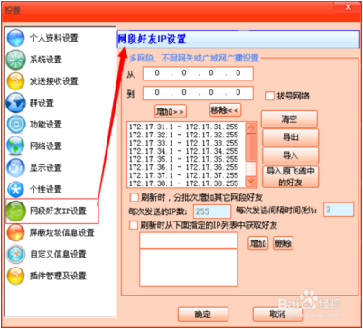 打开设置界面后,可以先修改一下自己的名称和组,默认用户名是电脑的登录用户,设置好后,选择左侧的“网段好友IP设置”,打开“网段好友IP设置”界面。输入你好友的网段地址,点击增加,如图所示: