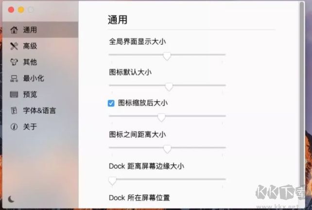 在偏好设置的通用面板中,你可以调整Dock图标的大小、图标之间的距离、Dock在屏幕中位置等。