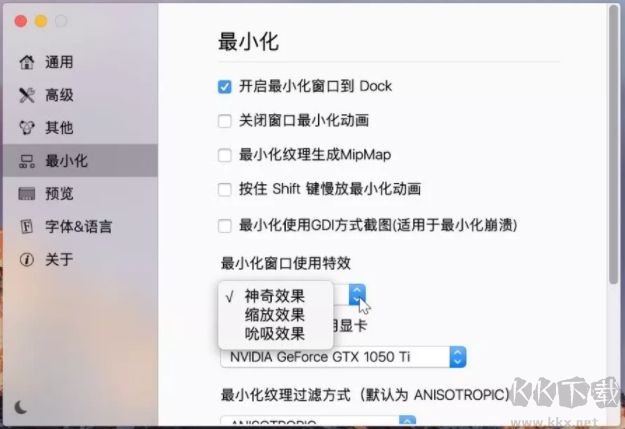在最小化面板中,你可以更改窗口最小化的动画效果,默认为神奇效果,如下图2,与MacBook的原生效果基本一致。