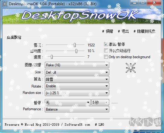 DesktopSnowOK中文版是一款可以让你的电脑桌面下雪的小软件,马上又要到同日了,如果你的办公室暖气太热那么完全可以使用这款美化你桌面的软件,静静的看着雪花飘落,如果窗外也同时在下雪,那么这个意境相信是会有所不同的!DesktopSnowOK是一款免费的软件,可以设置雪花的多少,透明度、落下速度、雪花大小等等,软件是绿色的无需安装,只有180KB。