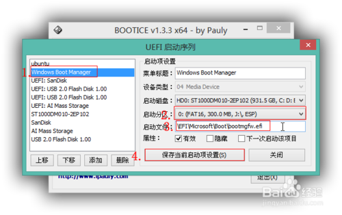 启动文件:\EFI\Microsoft\Boot\bootmgfw.efi,如果不是,把这串路径复制到红框3内。